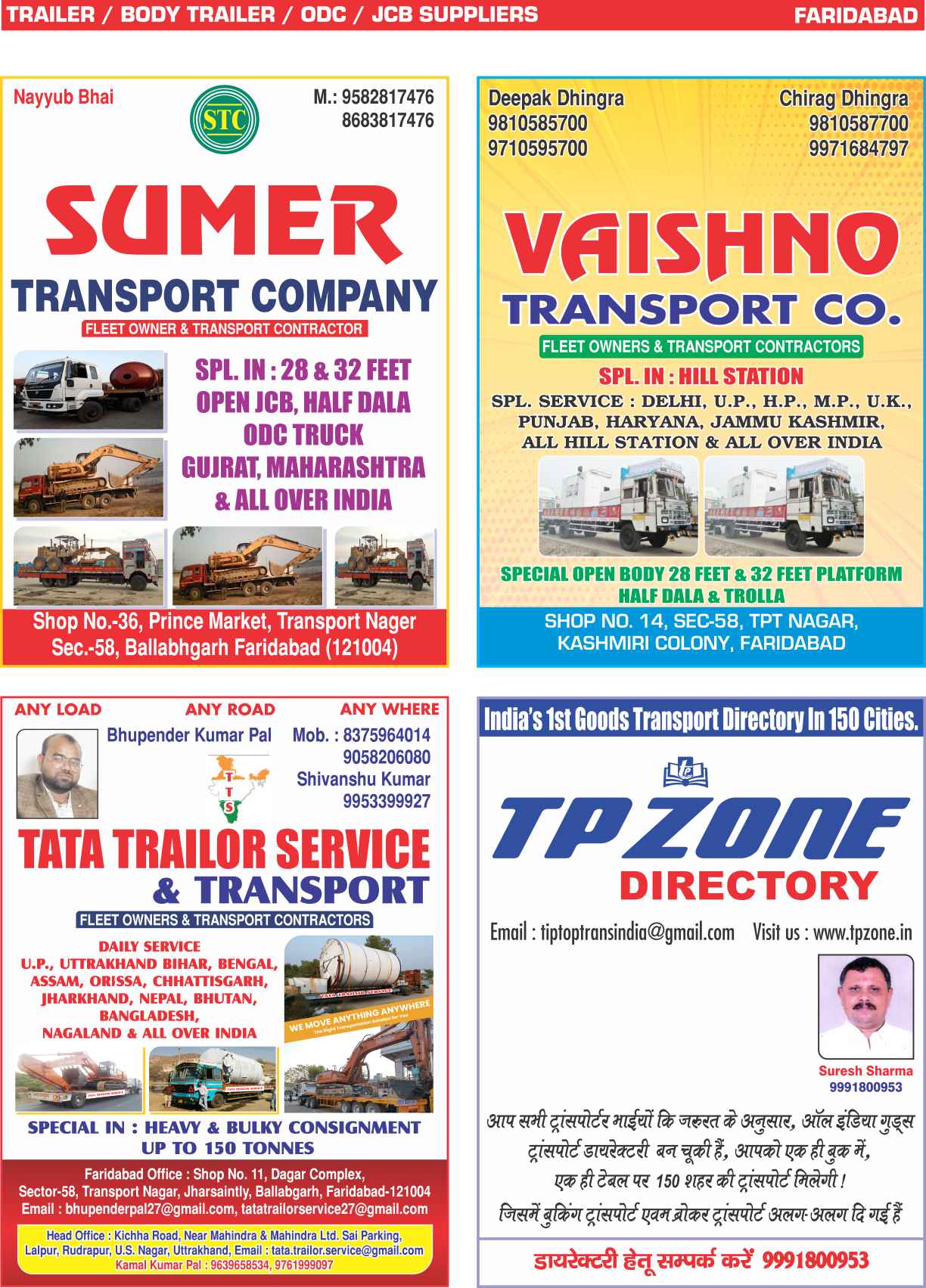 A lot of hard work has been executed to collect the general informations. Even thought, if any mistakes if found in misprinting TP Zone seeks pardon with folded hands. There are possibilities of mistakes in respect of collecting the contact No., Name, Address, male, website and it may be due to change of propriter, partener, manager and staff. To keep any trade relations with any transports, industries and trades, TP Zone will not be held responsible for such relations. All judicial disputes it will be settled in Gurugram dist. only (Haryana). All the rights are reserved with TP Zone.